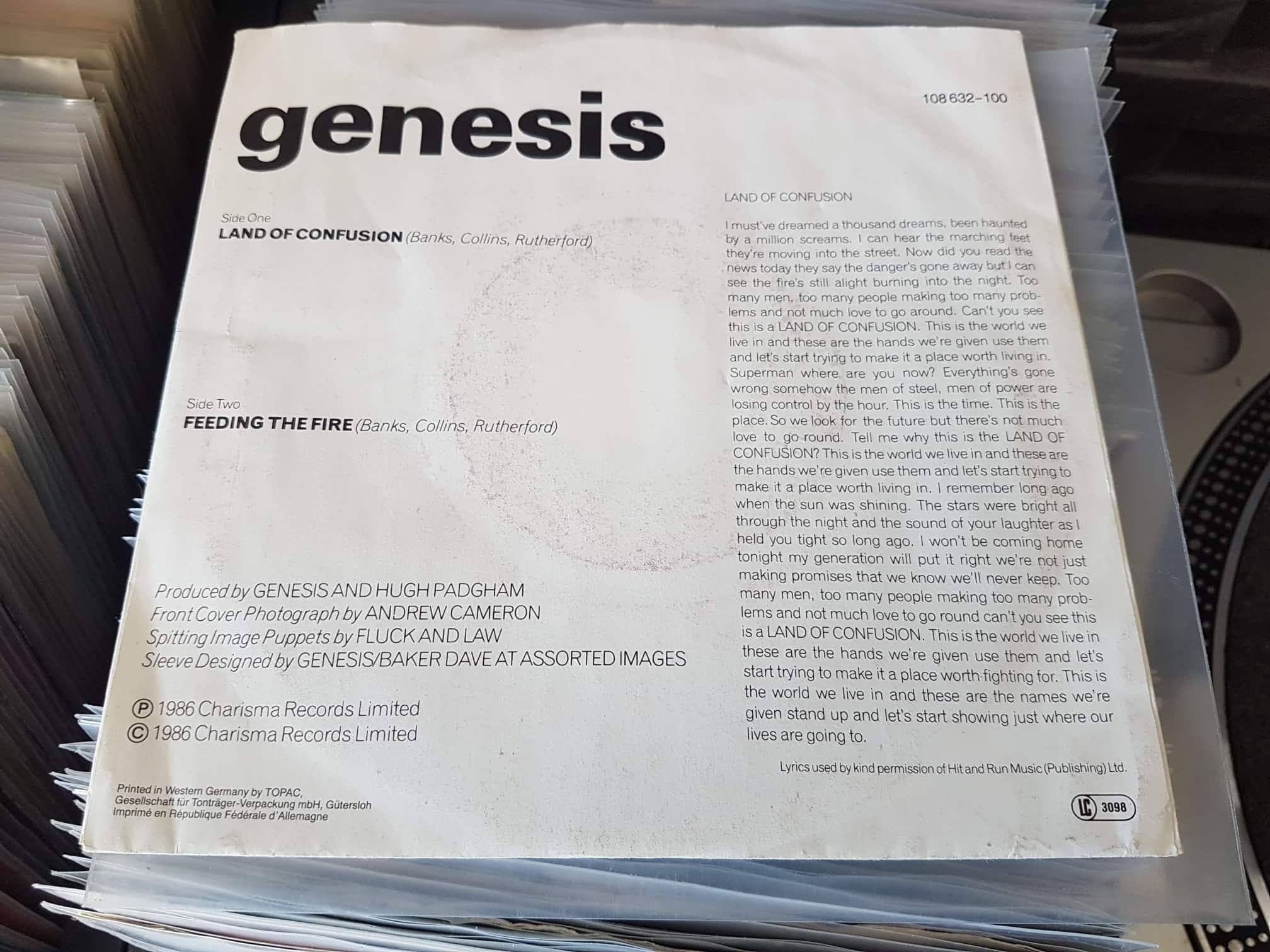 Also, meine Damen und Herren, Herren und Damen: heute geht es um den Pophit “Land of Confusion” von Genesis Die B-Seite heißt “Feeding the Fire”.